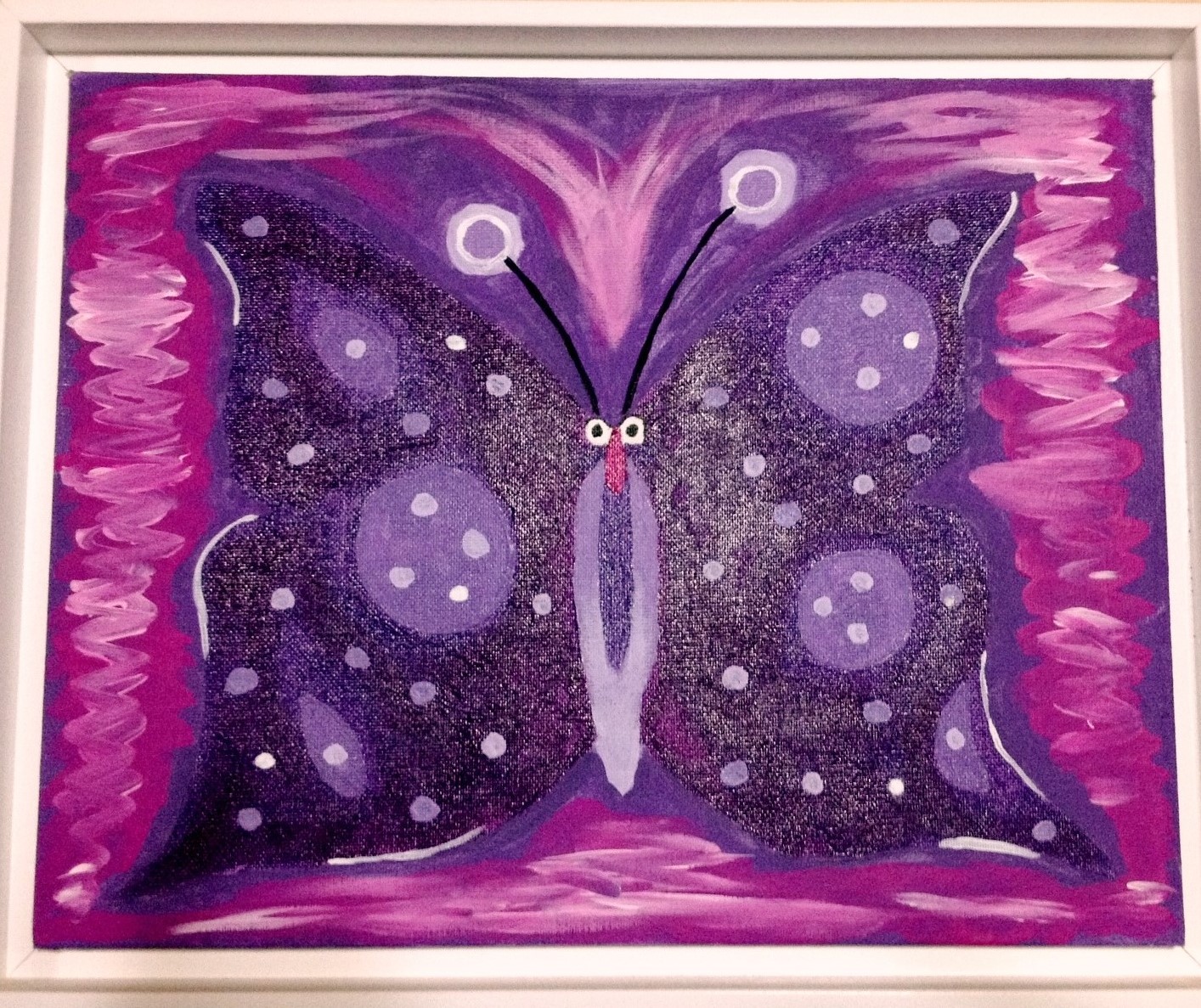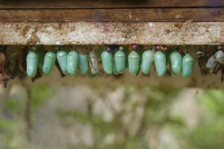 La mañana siguiente allí seguía el capullo y mientras ella comenzaba su rutina del café y el cigarro quedó observando la envoltura. Qué sorpresa se llevó al ver que la pequeña momia se abría poco a poco en su parte superior, cuenta ella que se abría como una flor o más bien como un calcetín enrollado hacia afuera, dice que era un evento mágico. Del capullo asomó una oruga de labios gruesos y rojizos con dos bigotitos de estilo clásico. Era blanco ostra con pintas café y sus ojos dos botones negros que se camuflaban en su piel, tenia un cuerpo rollizo, como un acordeón con múltiples aros.