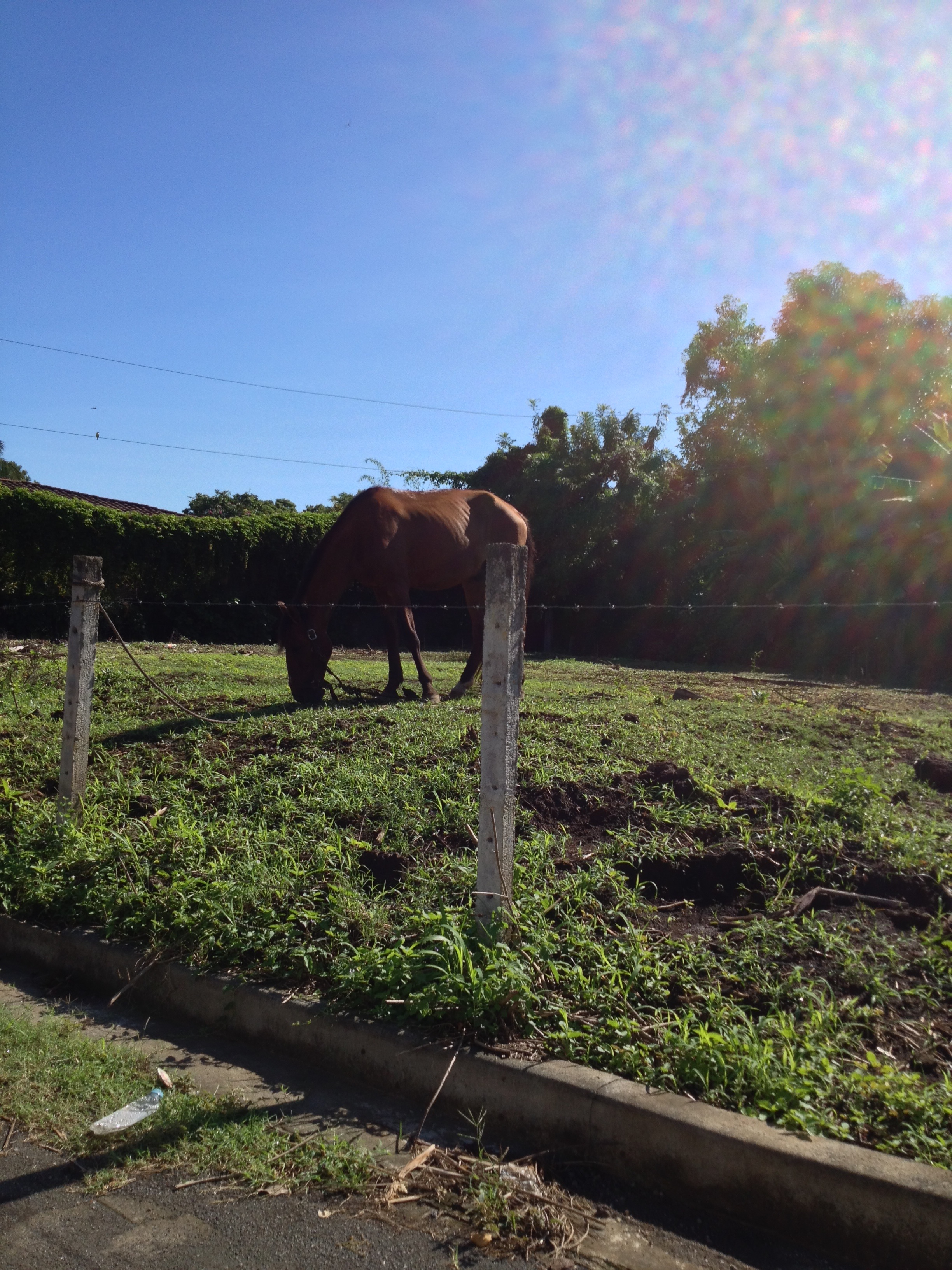 Volviendo a Hercules, sucede que se comió el zacate del lote donde esta alojado, es que los caballos comen todo el día. Hércules se comió 800 metros cuadrados de zacate en dos semanas. Dada las circunstancias, di entrada a nuestra calle a la mascota para que comiera el zacate al lado de mi casa, pensé que él se alimentaría y que también ayudaría a reducir la maleza, sería cosa de 4 días. Pero Hércules imprudente amaneció comiéndose la grama de una vecina y se armo un lío que acabo con su expulsión.