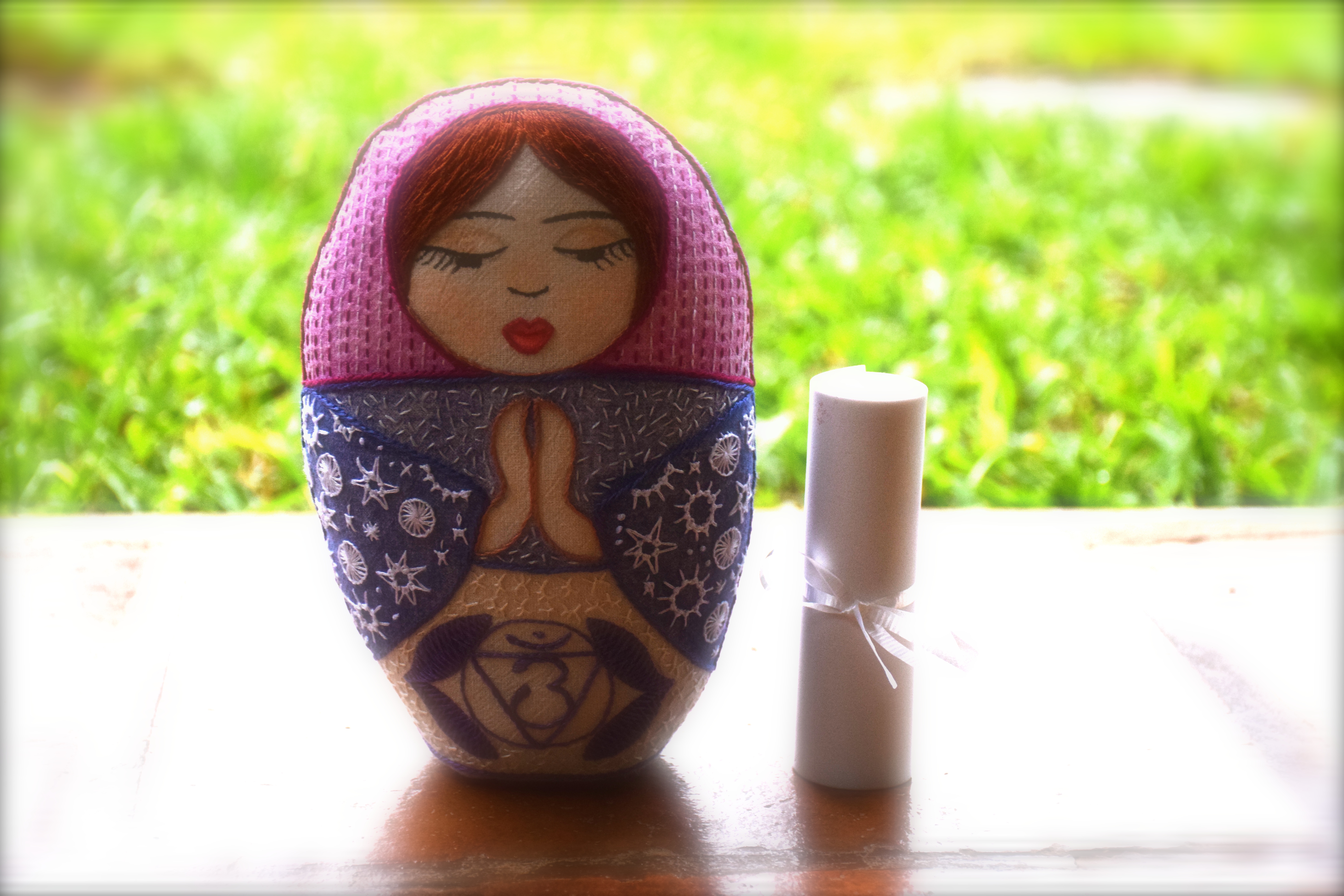 El pasado día de las madres solicité un regalo singular: una muñeca. Quizá la última vez que soñé con tener una fue a mis 9 años. Mi muñeca es una matrioska de manta confeccionada artesanalmente por las manos de María Tenorio, una artista del bordado, salvadoreña que entre otras ocupaciones es bloguera y maestra de redacción en una Universidad. La muñeca es acolchonada, pintada con crayolas que se fijan con el calor de la plancha, tiene cabello y yo la he perfumado con lavanda. Pueden ver las creaciones de María acá. Dale Click!!