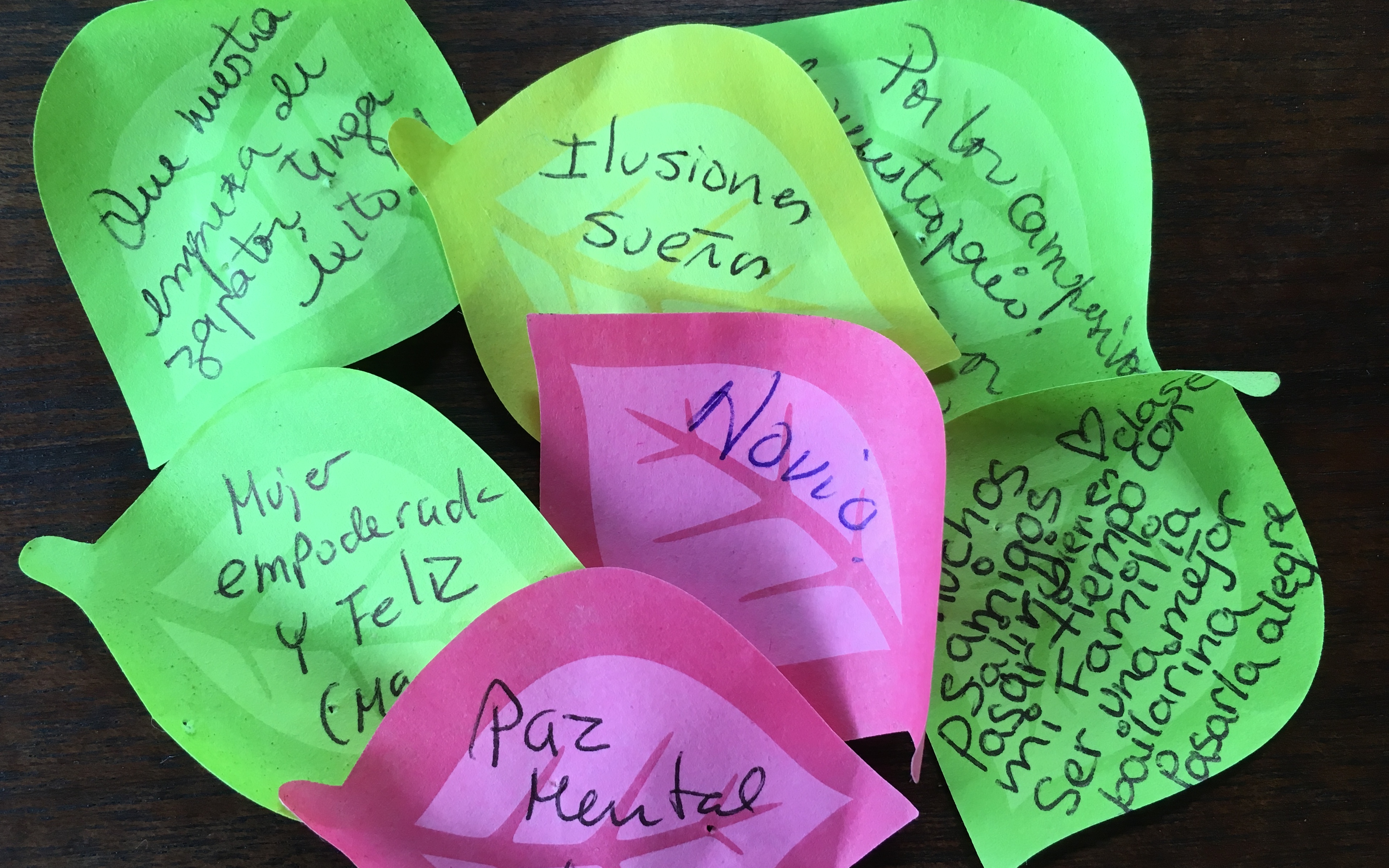 La navidad del 2014, a los pies del nacimiento que instalé -muy sencillo por cierto-, colgaron decenas de papelitos donde mis cercanos escribieron sus buenos deseos. Me pareció que así le daba más sentido al nacimiento puesto que representa la encarnación del bien y las ilusiones.