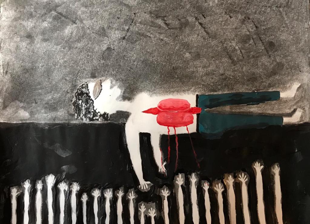 En medio del silencio me vi una tarde contando en unos papeles viejos una gran tragedia que nos ha tocado atestiguar, a miles les ha tocado vivir y a cienes les ha tocado morir, me lo conté a mí y hoy se lo cuento a ustedes en estas dos ilustraciones hechas por mi con pintura acrílica, lápiz de grafito y carboncillo.