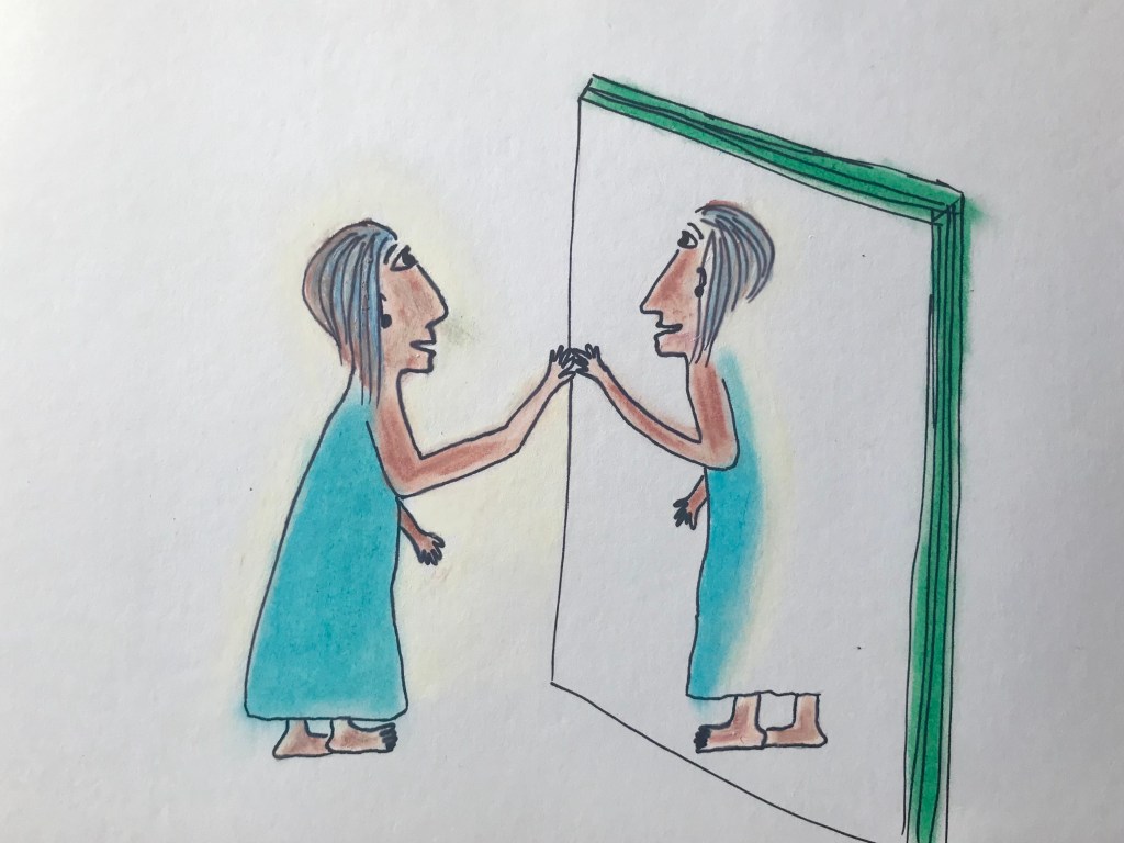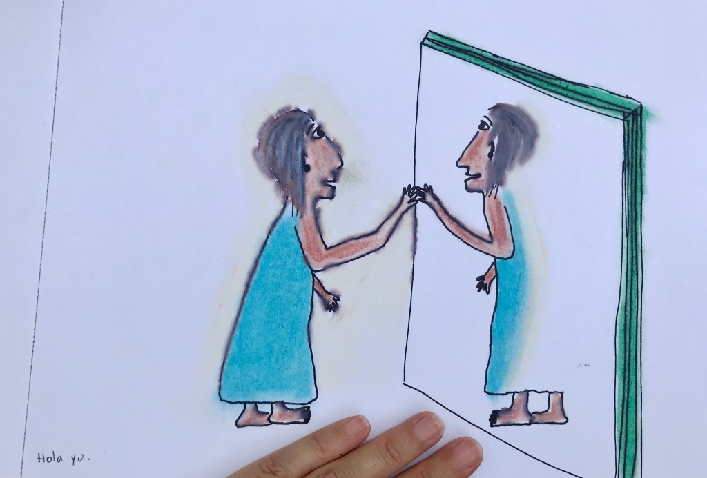 3. Yo en el espejo…Es extraño que no me represento usando anteojos, quizá sea porque no domino la técnica del dibujo o porque aunque los uso desde los 39 -la presbicia me dio anticipada-, no los he incorporado en mi mapa mental. De cualquier forma, acá estoy yo en frente al espejo en el ejercicio de reconocerme de nuevo, y veo mis mejillas caídas, veo decenas de nuevos lunares en la cara y en todo el cuerpo, me pongo de lado, del otro lado, de espalda, me visto y me doy el visto bueno cada nuevo día, pero antes me digo: ME QUIERO