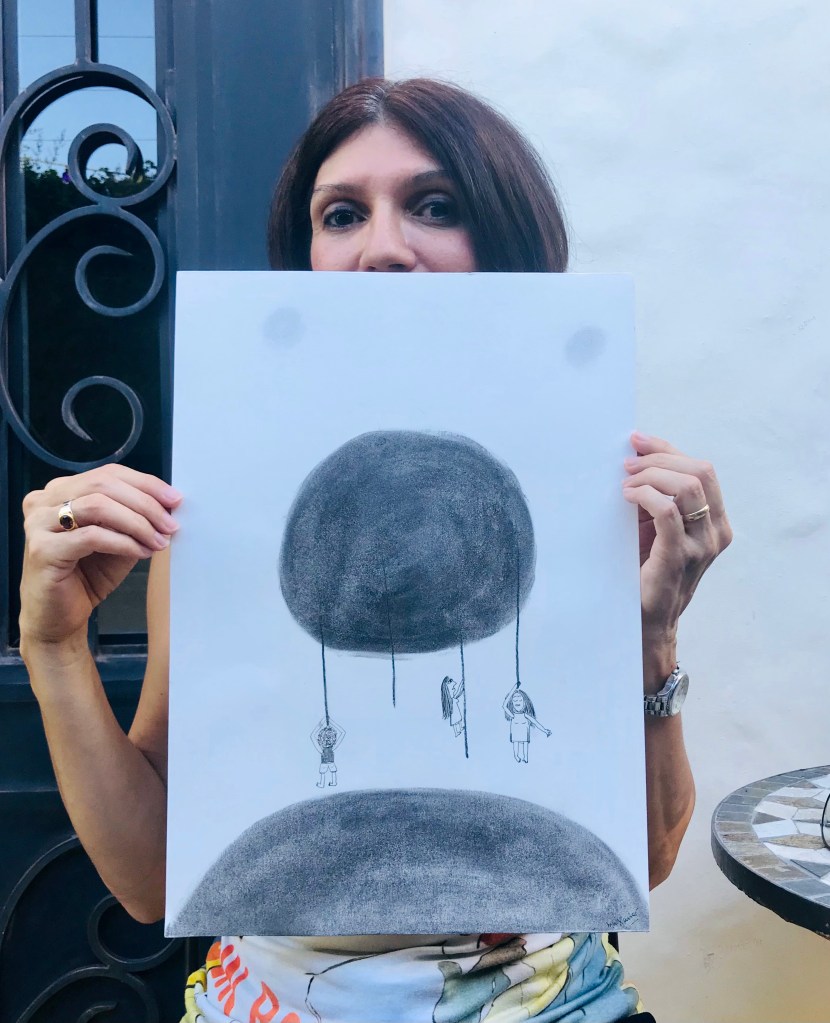 2. Bajando la luna… ilustración monocromática, con sabor a drama, en ese momento me sentía inquieta con la idea de llegar a los 50. Cuenta que yo voy bajando con las amigas de mi generación, hay una cuerda libre para las que pronto tendrán que descender. La luna está muy asociada a nosotras, a nuestra menstruación, a nuestro humor, es un astro romántico, esa gran luz encendida que a mí me inspira de noche y disfruto fotografiar. Bajando la luna hacia la realidad dura, donde tenemos que seguir la vida con los cambios a cuesta.