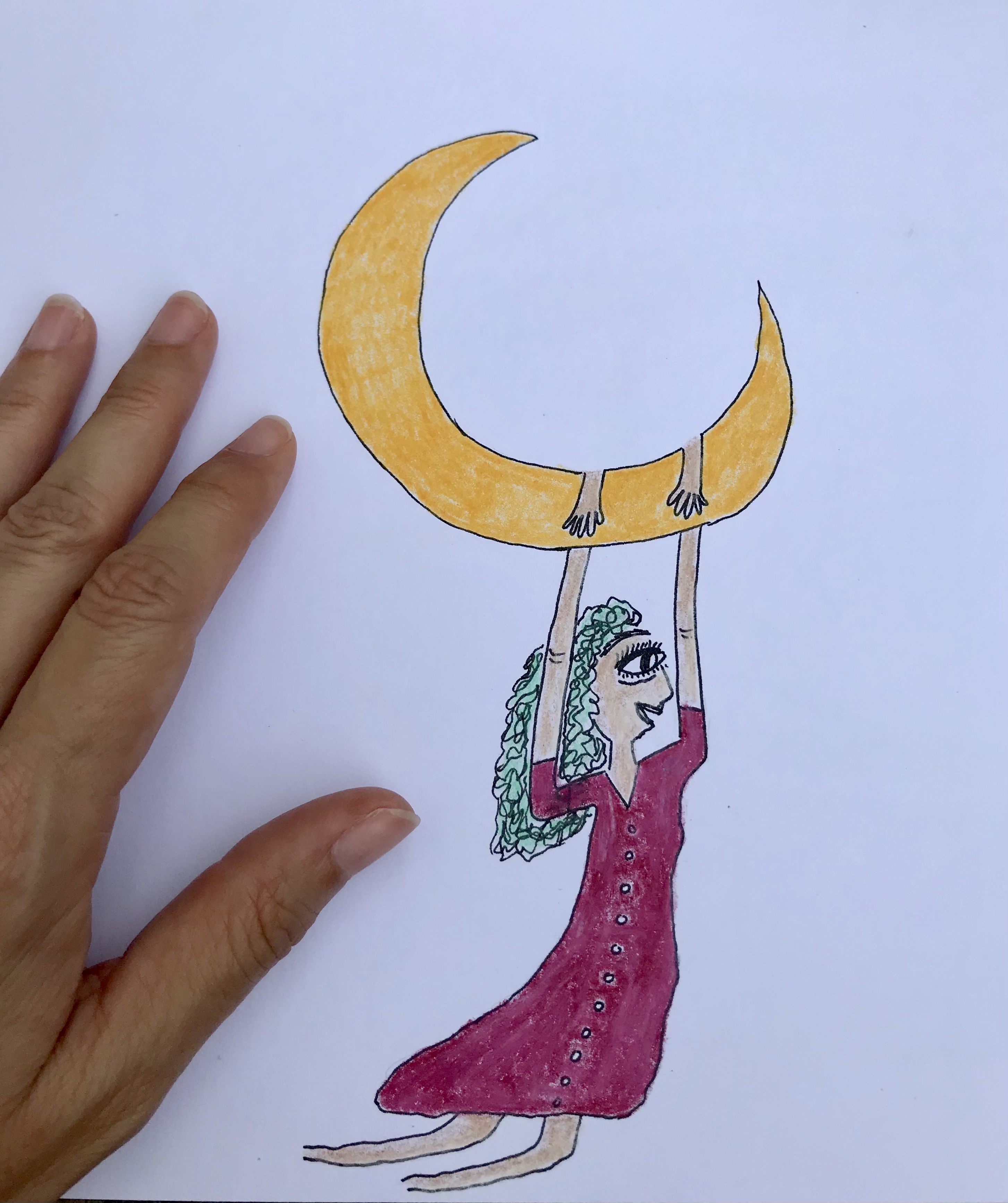 5. Conversando con la luna… le doy las gracias, ambas nos vemos a los ojos, en silencio, no hace falta hablar, trato de sostenerla en mis manos para luego dejarla volar a su órbita. Ilustración de Julio 2021