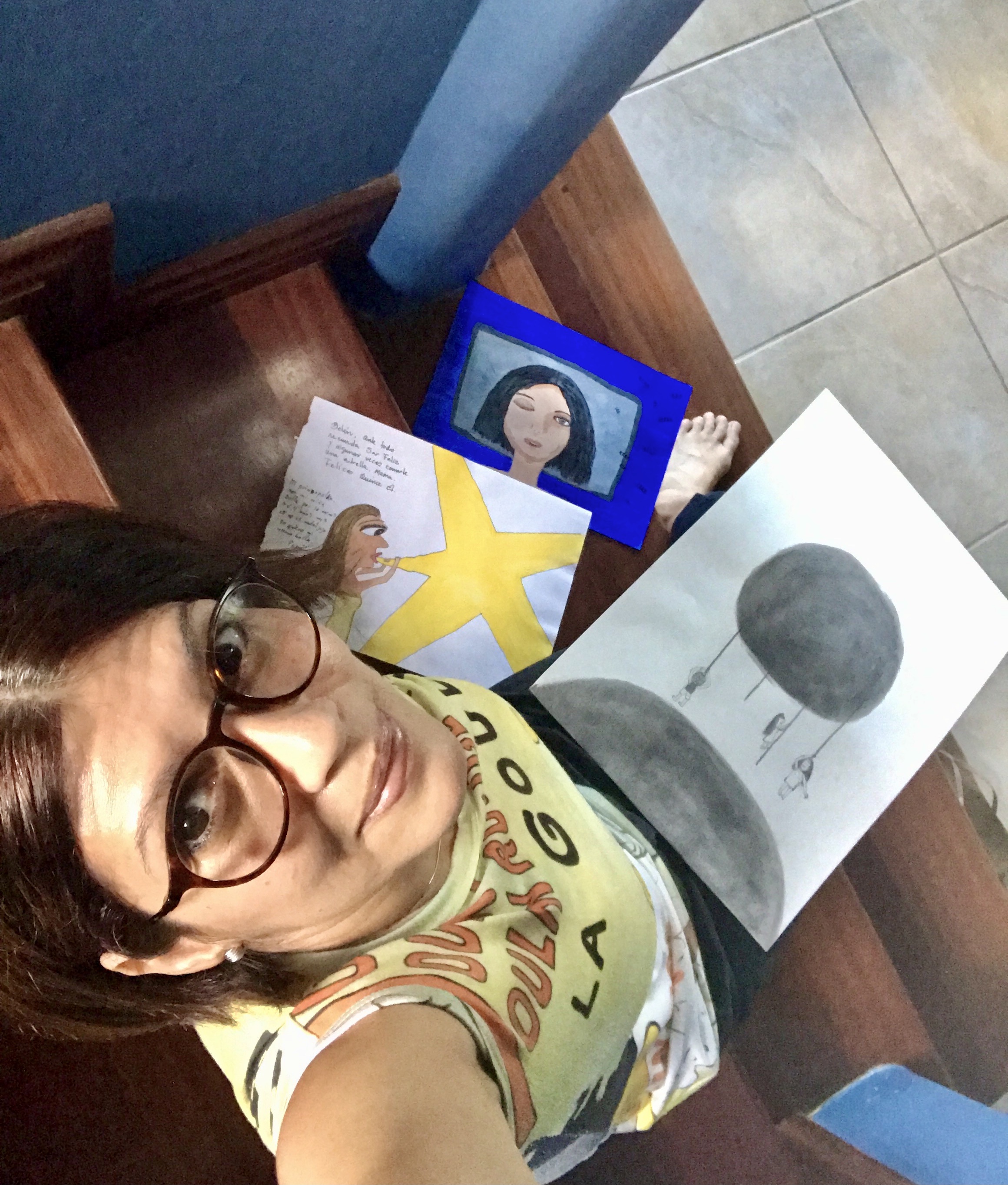 3. Yo en el espejo…Es extraño que no me represento usando anteojos, quizá sea porque no domino la técnica del dibujo o porque aunque los uso desde los 39 -la presbicia me dio anticipada-, no los he incorporado en mi mapa mental. De cualquier forma, acá estoy yo en frente al espejo en el ejercicio de reconocerme de nuevo, y veo mis mejillas caídas, veo decenas de nuevos lunares en la cara y en todo el cuerpo, me pongo de lado, del otro lado, de espalda, me visto y me doy el visto bueno cada nuevo día, pero antes me digo: ME QUIERO