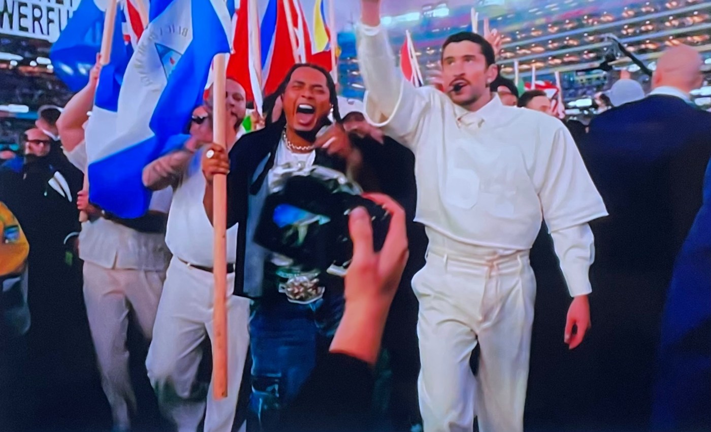 El show ya era electrizante por todo su contenido, por la selección musical, por las performances, por los bailes, la escenografía, etc, pero la gran cereza para mí, fue escuchar a Bad Bunny nombrando a cada país de América, de abajo hacia arriba, haciéndonos presente en ese escenario de visibilidad global, usando su fuerza vocal para decir ACÁ ESTAMOS, somos todos, plantando así la bandera de cada uno en ese suelo donde tantos han buscado el SUEÑO AMERICANO, y que hoy en día padecen las peores cacerías y vejámenes.